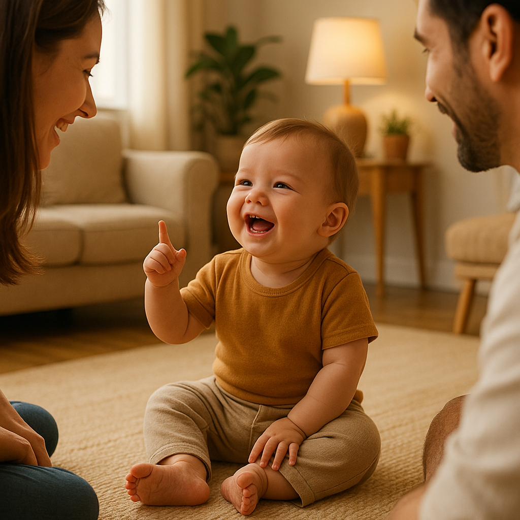 대부분의 아기는 생후 4~6개월경 옹알이를 시작한다. 처음에는 의미 없는 반복음(“바바”, “다다” 등)이 중심이지만, 생후 10~14개월 사이에 의미 있는 첫 단어가 나타나는 경우가 많다. “엄마”, “물”, “안돼”처럼 일상에서 자주 듣는 단어가 첫 말이 되는 경우가 많다. 18개월쯤에는 10~20개의 단어를 발음할 수 있는 경우가 일반적이다.